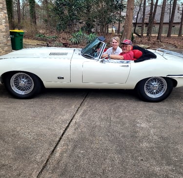 Here's a photo of my 1971 E Type OTS. My wife, Sally, is also in the picture. This car was in the last batch of 4.2, six cylinder cars before the switch to the Series three. In addition to the chrome wire wheels it has power steering and A/C. The car underwent a 5 year total restoration prior to my purchase from the previous owner. Three SU carbs replace the two Stromberg carbs and the power is fantastic.
